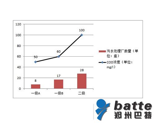 按照國(guó)家標(biāo)準(zhǔn),污水處理廠污染物排放標(biāo)準(zhǔn)由高到低分為一級(jí)A、一級(jí)B和二級(jí)三類(lèi),尾水中的COD濃度限值從50mg/l、60mg/l到100mg/l依次升高。而上?,F(xiàn)有污水處理廠的排放標(biāo)準(zhǔn)總體等級(jí)偏低,8成污水處理量只達(dá)到二級(jí)標(biāo)準(zhǔn)。